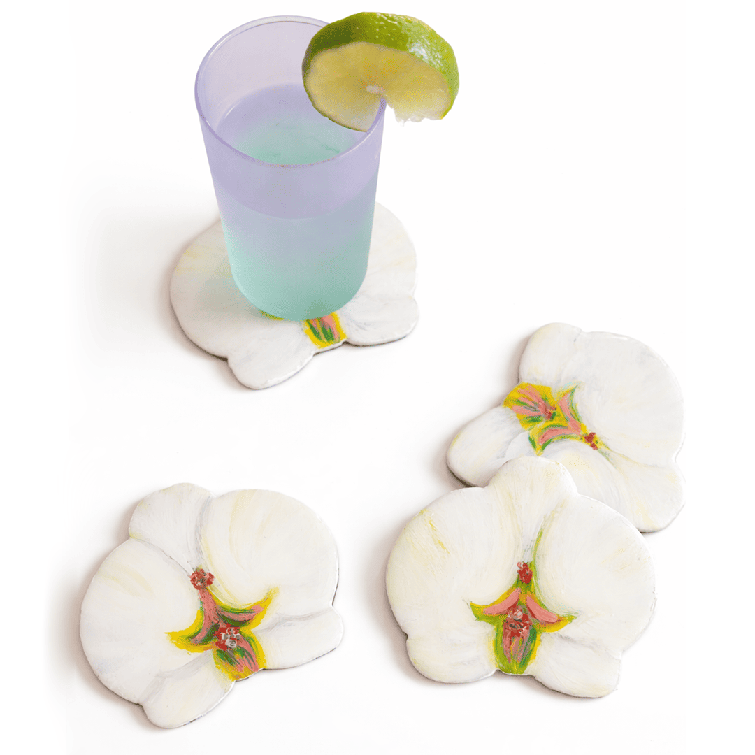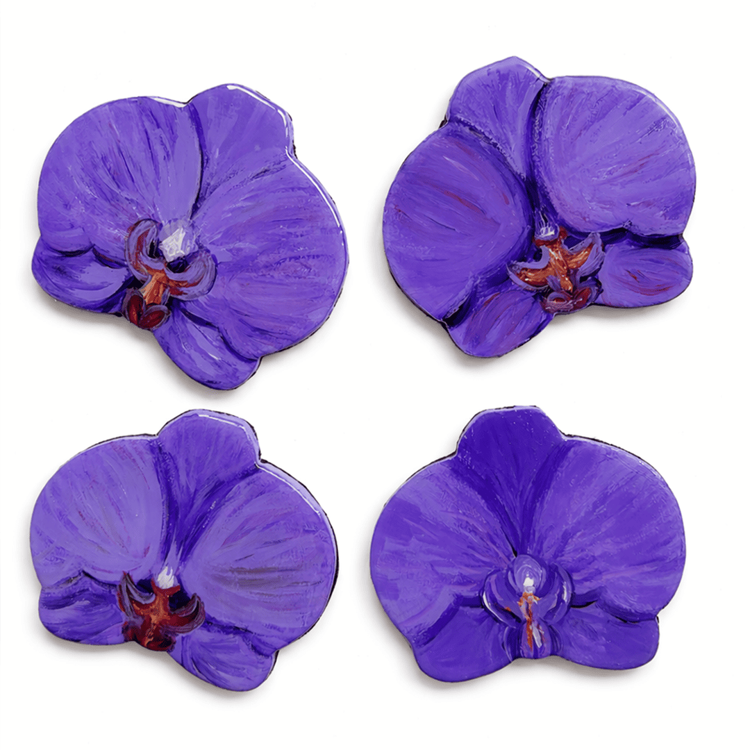 Set de 4 o 6 portavasos con forma de orquídea, pintados y elaborados a mano, con acabado en resina.